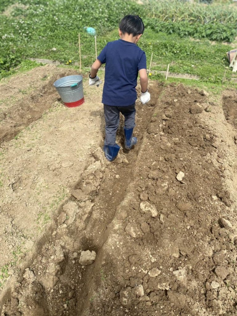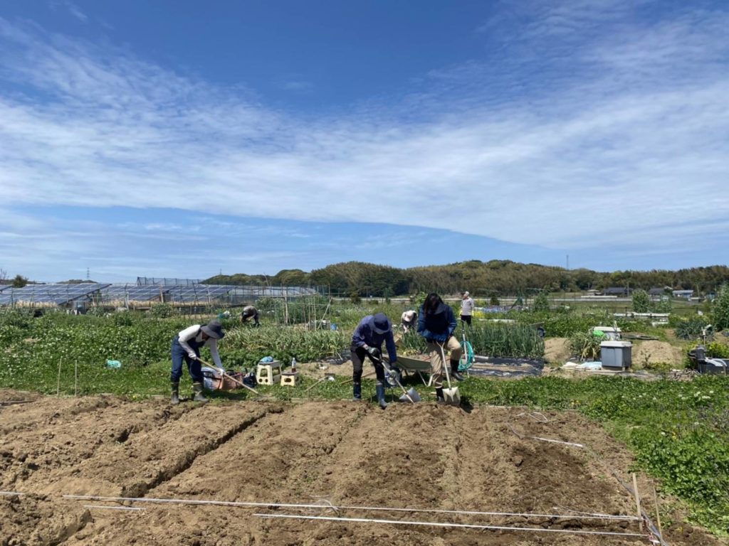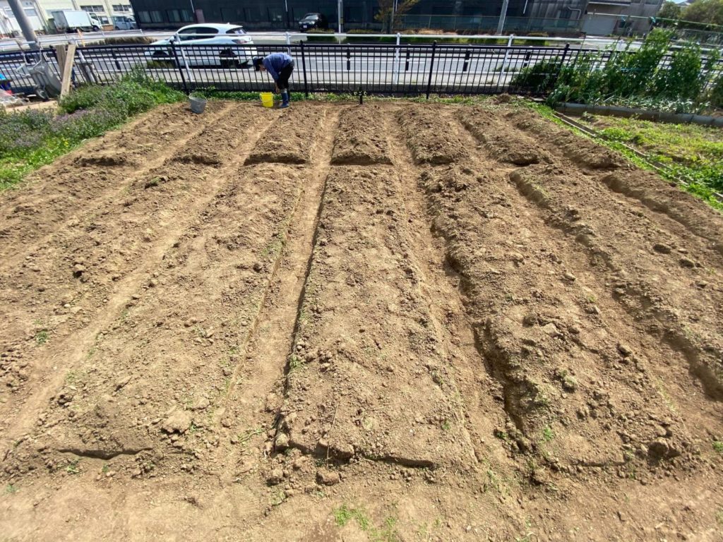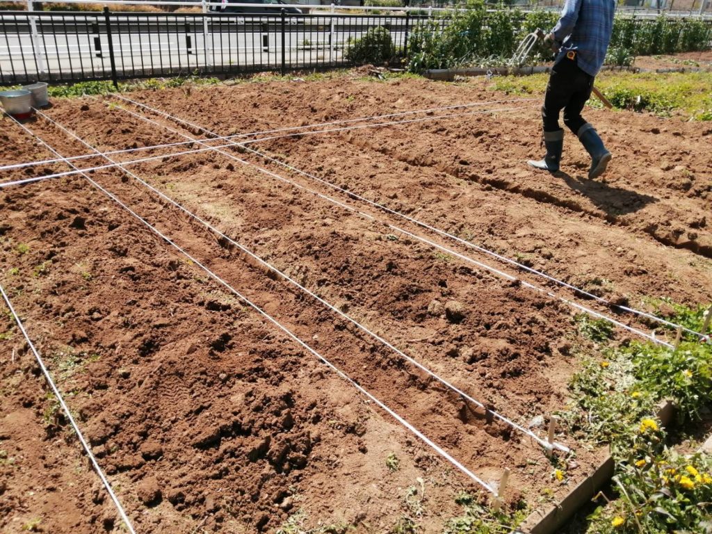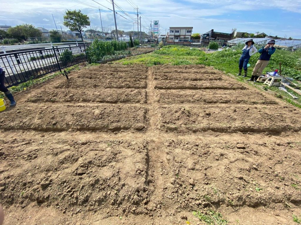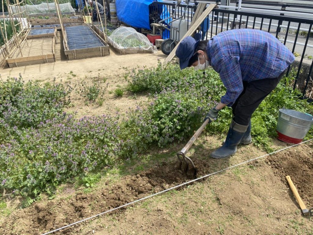 くわやスコップなどを使い、畝づくりをスタート。すぐに汗が出てきますが少し強い春風が心地よいです。